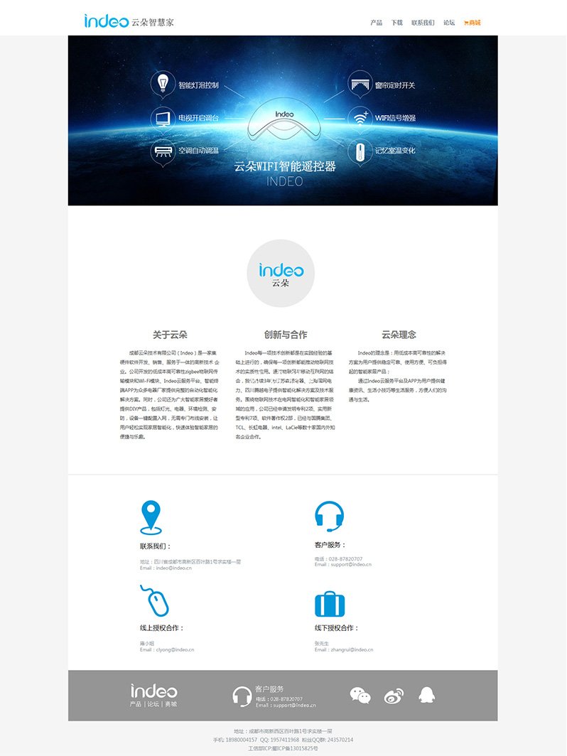 成都云朵技術有限公司(Indeo)是一家集硬件軟件開發、銷售、服務于一體的高新技術 企業。公司開發的低成本高可靠性zigbee物聯網傳輸模塊和Wi-Fi模塊、Indeo云服務平臺、智能終端APP為眾多電器廠家提供完整的自動化智能化解決方案。同時,公司還為廣大智能家居愛好者提供DIY產品,包括燈光、電器、環境檢測、安防,設備一鍵配置入網,無需專門布線安裝,讓用戶輕松實現家居智能化,快速體驗智能家居的便捷與樂趣。