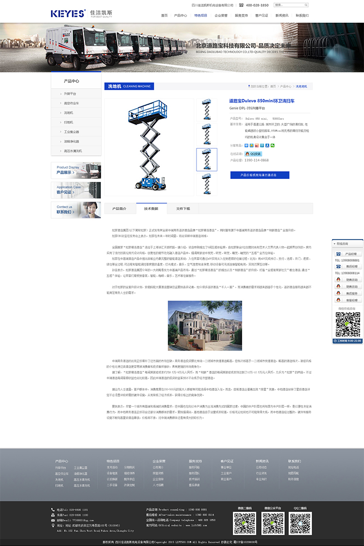 北京道路寶科技有限公司成立于2004年,一直致力于改善空氣環境事業,我們擁有世界唯一的,裝配GORE過濾系統的地面清掃機械。擁有意大利DULEVO INTERNATIONAL強力技術與產品支持、代理意大利IPC-GANSOW、美國GENIE、法國HAULOTTE等世界著名清潔設備、高空作業平臺等工程機械。意大利DULEVO INTERNATIONAL機械清掃車,涉及年度單一型號暢銷產品銷售額突破2000萬人民幣,最近三年累計銷售額更突破5000萬人民幣,在行業設備銷售公司名列前茅。并先后通過ISO9001質量管理體系、ISO14000環境管理系列標準。